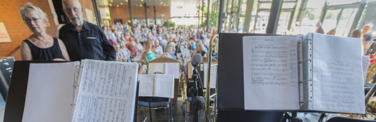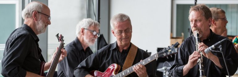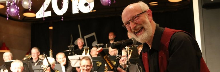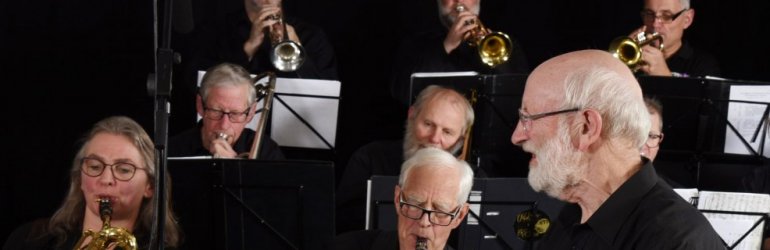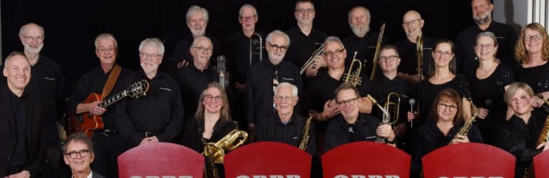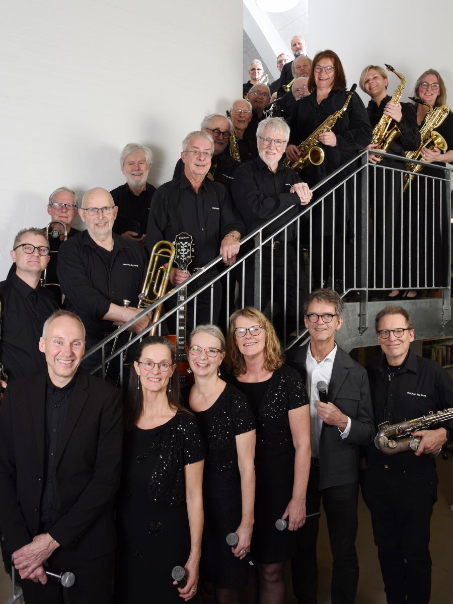 Old Boys Big Band med musikere, sangere og lydmand tæller i fuld opstilling omkring 30 mand m/k.